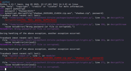 1import pyAesCrypt23# Leer rockyou4with open("rockyou.txt", "r") as wordlist:5 for password in wordlist:6 password = password.strip()78 try:9 pyAesCrypt.decryptFile("data.txt.aes", "dataout.txt", password)10 print(f"[+] Encontrado contraseña: {password}")11 break12 except:13 pass