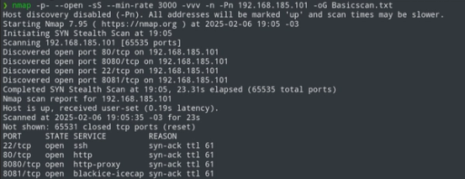 nmap -p- --open -sS --min-rate 3000 -vvv -n -Pn 192.168.185.101 -oG Basicscan.txt
