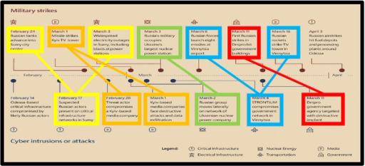 Desde el inicio de la invasión rusa de Ucrania las acciones de grupos rusos de ciberamenazas se intensificaron, realizando acciones para apoyar los objetivos estratégicos y tácticos de sus fuerzas armadas. En la imagen que se ve debajo hay una cronología de ataques a infraestructuras críticas y la coordinación con otros ataques llevados a cabo por medios militares. En ocasiones, los ataques a redes informáticas precedieron inmediatamente a un ataque militar, según afirmó la OTAN en un reporte de lecciones aprendidas del año 2022, pero no se ha establecido fehacientemente una relación directa.