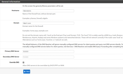 Configura el hostname (nombre del firewall) y el dominio (puedes dejarlos por defecto en un laboratorio).
