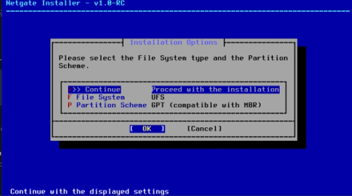 Para nuestro entorno de laboratorio y para optimizar el uso de memoria, cambiaremos a UFS. Usa las flechas del teclado para navegar hasta "file system" y presiona Enter para cambiarlo.