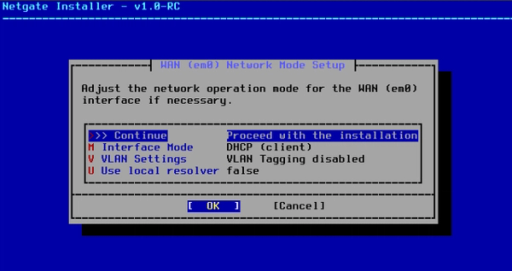 Se te pedirá identificar la interfaz que será la WAN. En nuestro setup de VirtualBox, esta es la interfaz configurada en modo puente (bridged), lo que permite que reciba una dirección IP directamente de tu router físico, simulando ser un dispositivo más en tu red. En este caso recibe el nombre de em0.