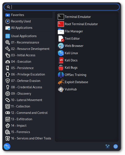 Uno de los cambios más profundos y transformadores de Kali Linux 2025.2 es la reorganización total del menú de aplicaciones.