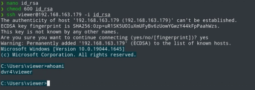 Encontré la id_rsa del usuario Viewer por lo que prosigo a darle permisos 600 y acceder a la maquina